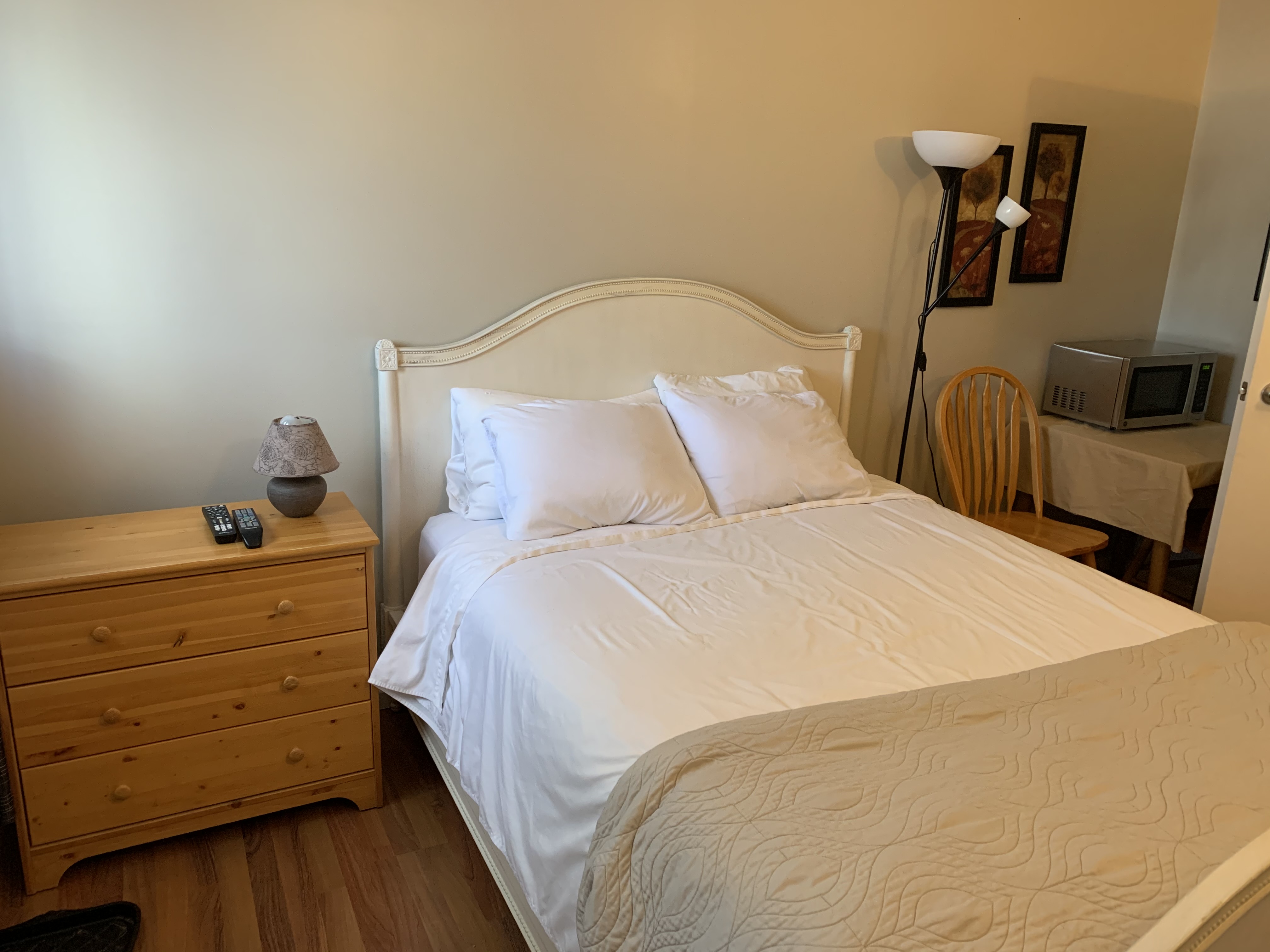 This ground floor Queen room comes with a private exterior entrance and ensuiteĀ (roll in shower). This room has satellite TV and a mini kitchenette.